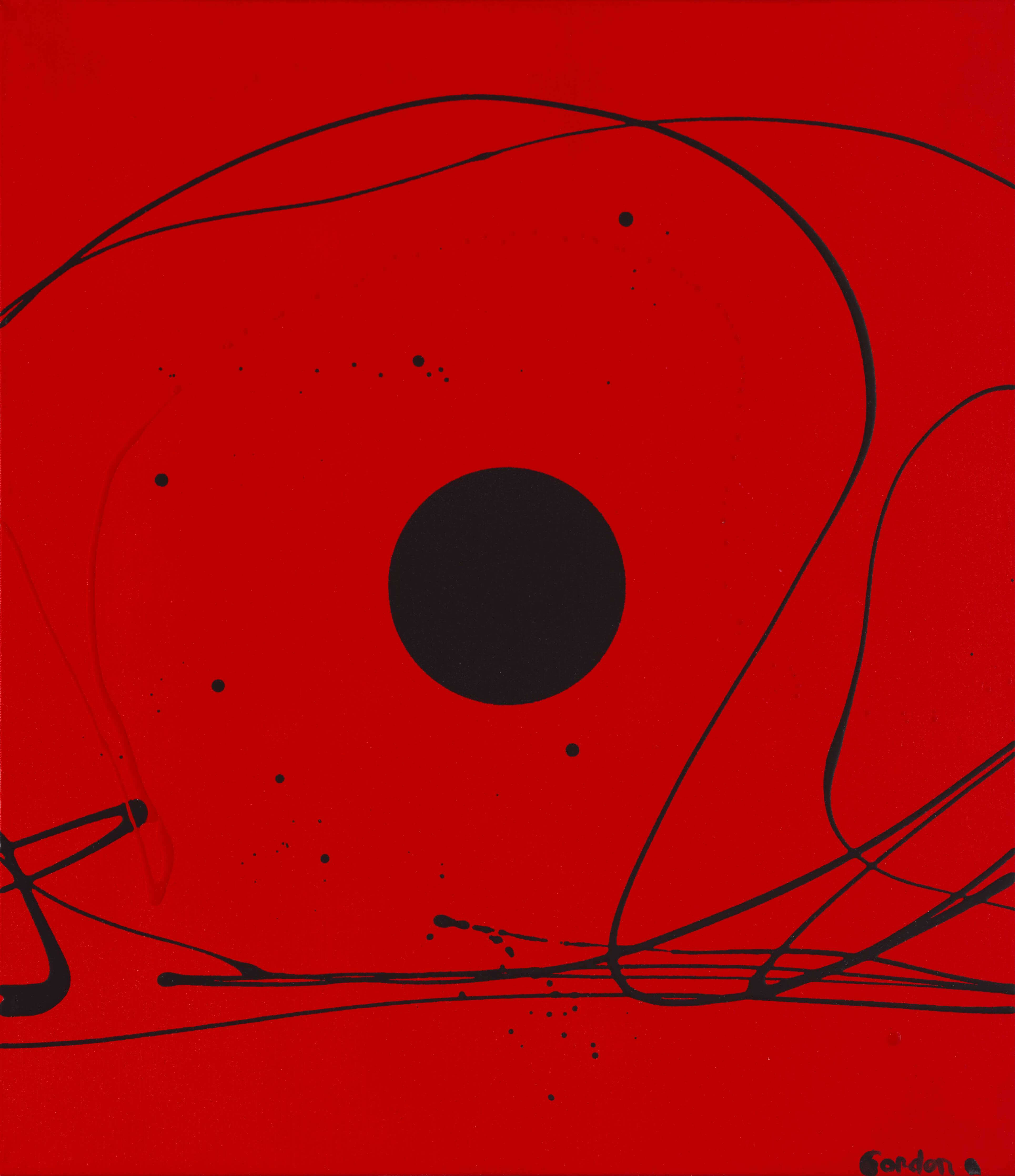 This piece features a central black sphere on a vibrant red background, creating a powerful visual statement. Measuring 75 x 65 cm (29 x 26 in), 'Emotion 11' makes a striking addition to any art collection. Previously exhibited at the prestigious Hotel De Paris in Monte Carlo and Hotel Majestic in Cannes, this painting carries a distinguished provenance directly from the artist, Antonia Pia Gordon. It's a piece that speaks volumes about the irresistible attraction of opposites and the fearless co-existence of vivid and dramatic colors.Details
