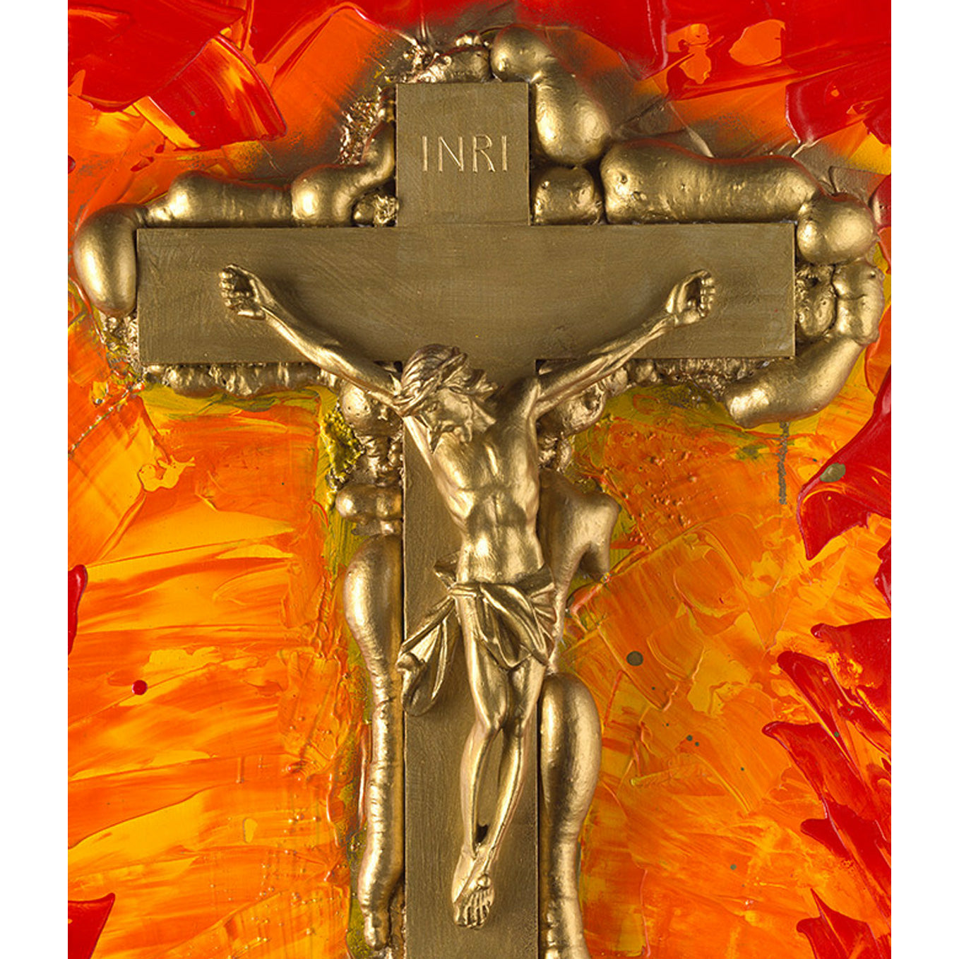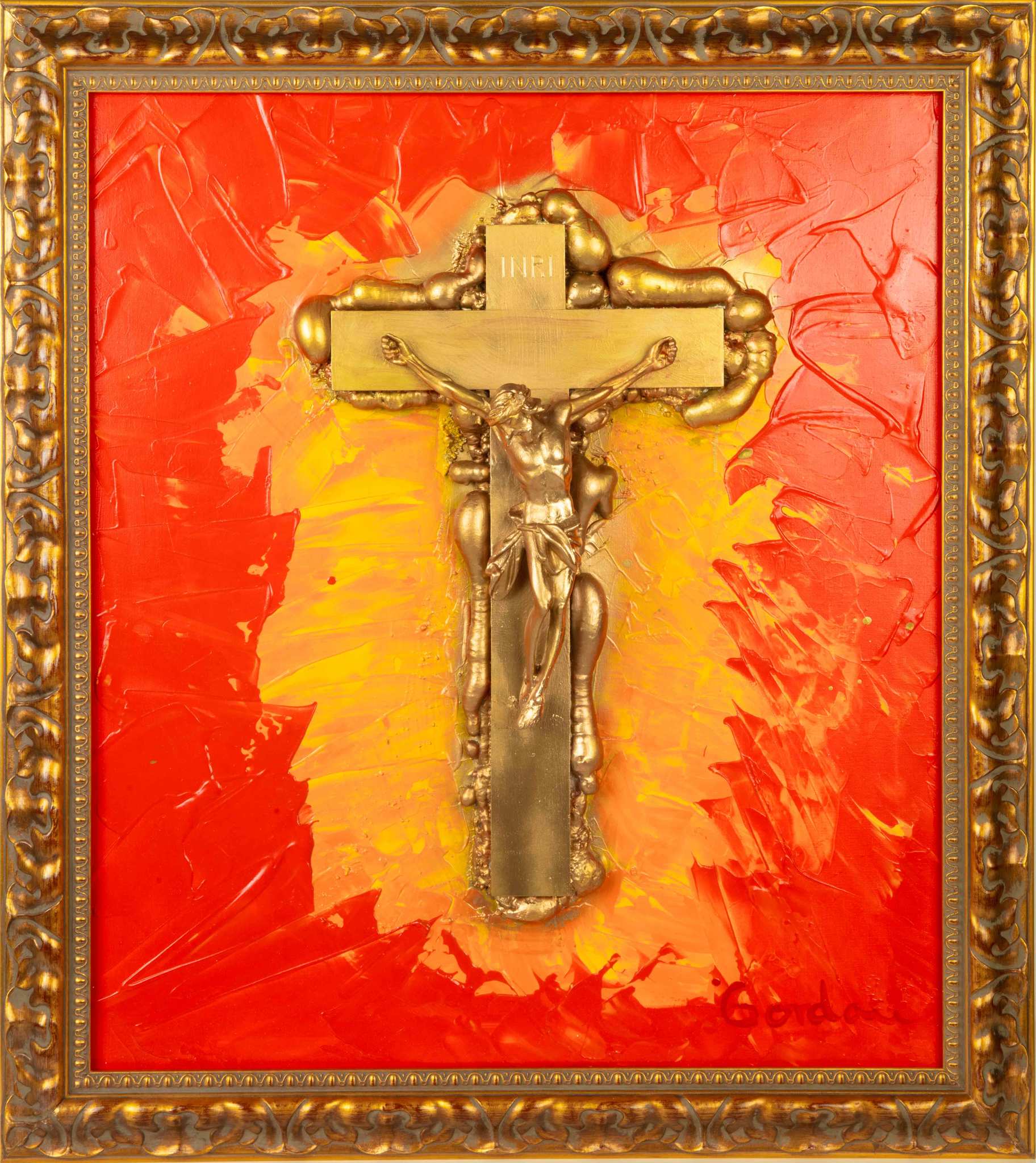Crafted with a unique spatula technique, 'Father Joseph' features a striking metallic Christ emblem that catches the light, creating a mesmerizing interplay of shadows and highlights. The gold framing enhances the artwork's luxurious appeal, making it a sophisticated addition to any discerning collector's space.