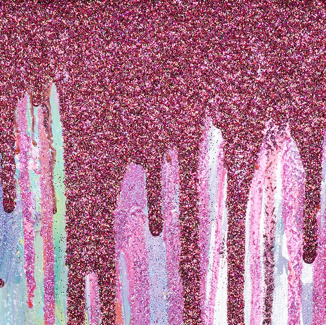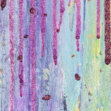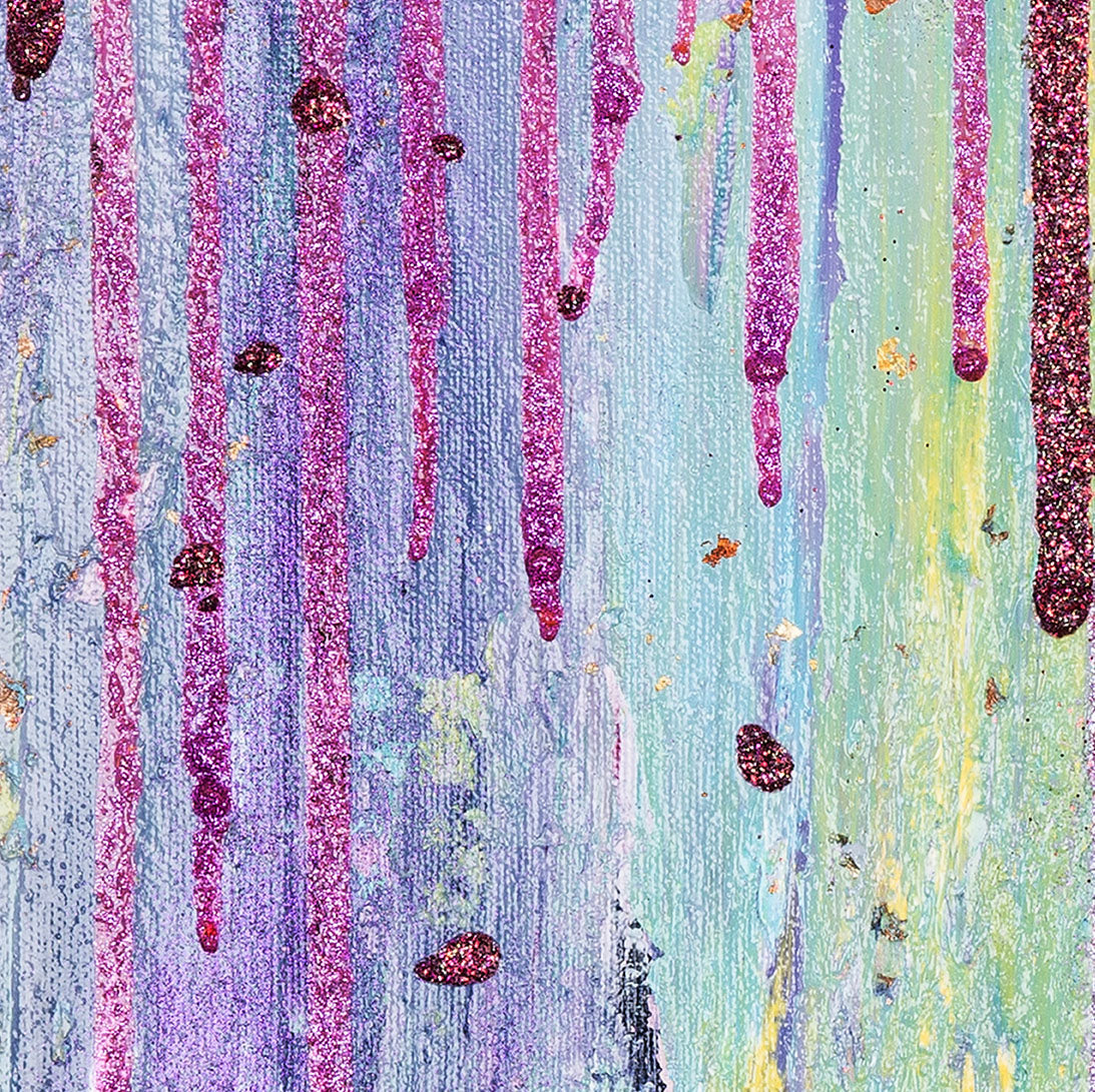 The artwork features a captivating blend of forest green and burgundy glitter cascading over violet and turquoise hues, creating a dynamic interplay of light and shadow. Antonia Pia Gordon's innovative use of acrylics and mixed media brings a unique depth and vitality to the canvas, inviting viewers to explore the intricate layers and textures up close. Each stroke is a testament to Gordon's mastery, reflecting her global travels and profound connection to the natural world.