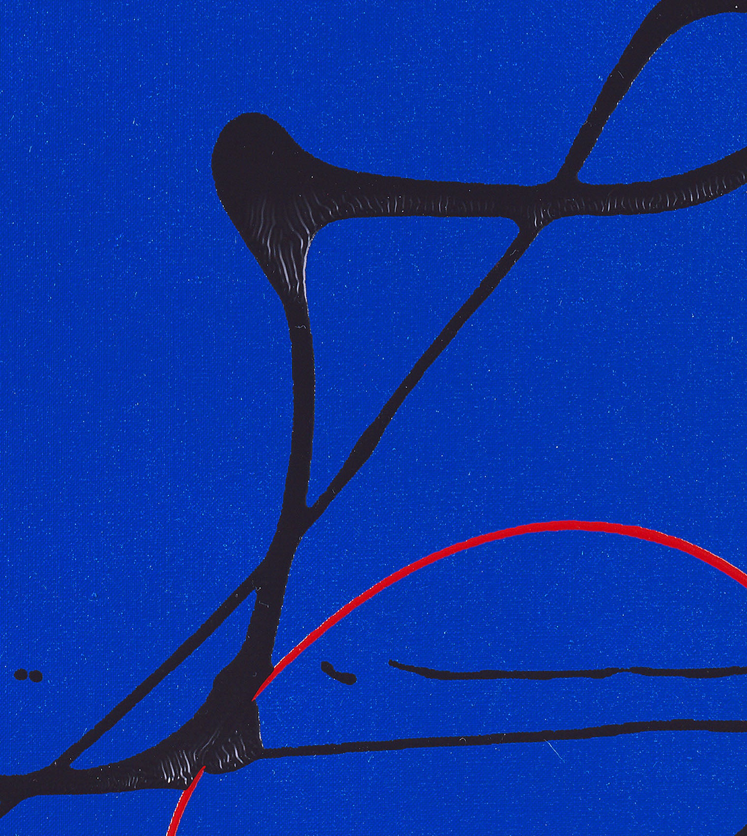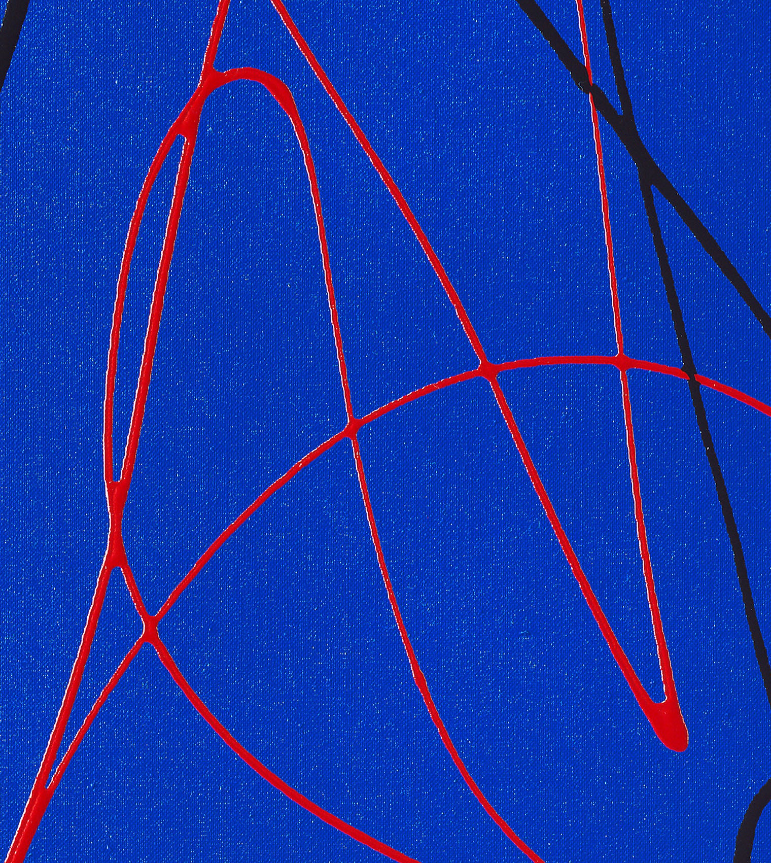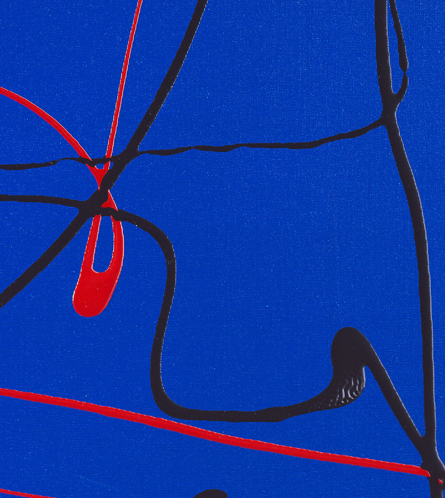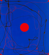 Measuring 95 x 85 cm (37 x 33 inches), 'Vitality 3' captures the essence of life's deepest patterns and the unity of consciousness. Each stroke is a journey into the fluid freedom of thought, moving tradition into modernity with every layer. The black sphere amidst a vibrant blue and red spatter creates a mesmerizing visual experience, inviting introspection and awe.