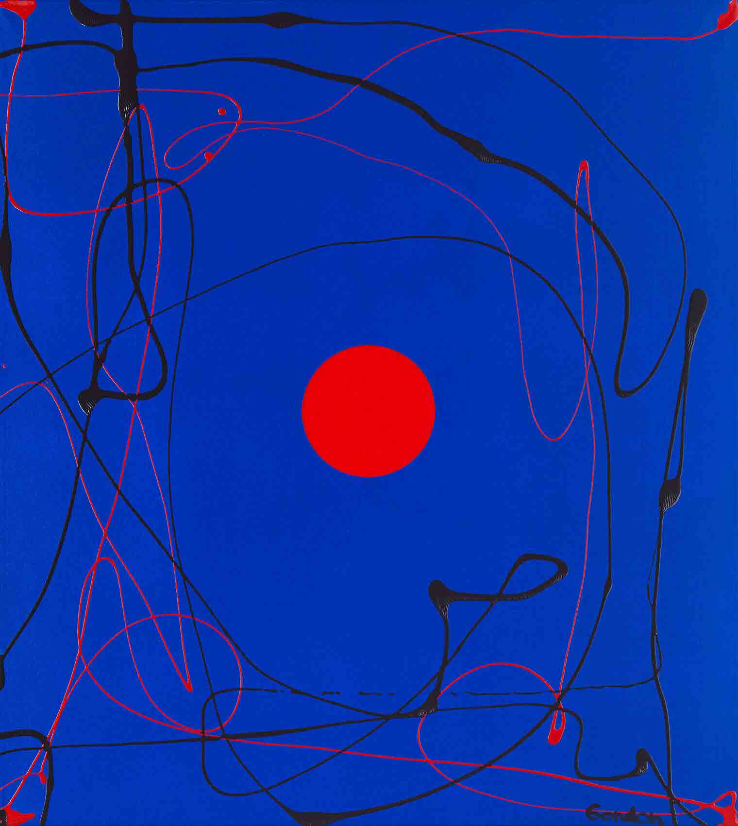 This piece features a central black sphere on a vibrant red background, creating a powerful visual statement. Measuring 75 x 65 cm (29 x 26 in), 'Emotion 11' makes a striking addition to any art collection. Previously exhibited at the prestigious Hotel De Paris in Monte Carlo and Hotel Majestic in Cannes, this painting carries a distinguished provenance directly from the artist, Antonia Pia Gordon. It's a piece that speaks volumes about the irresistible attraction of opposites and the fearless co-existence of vivid and dramatic colors.Details