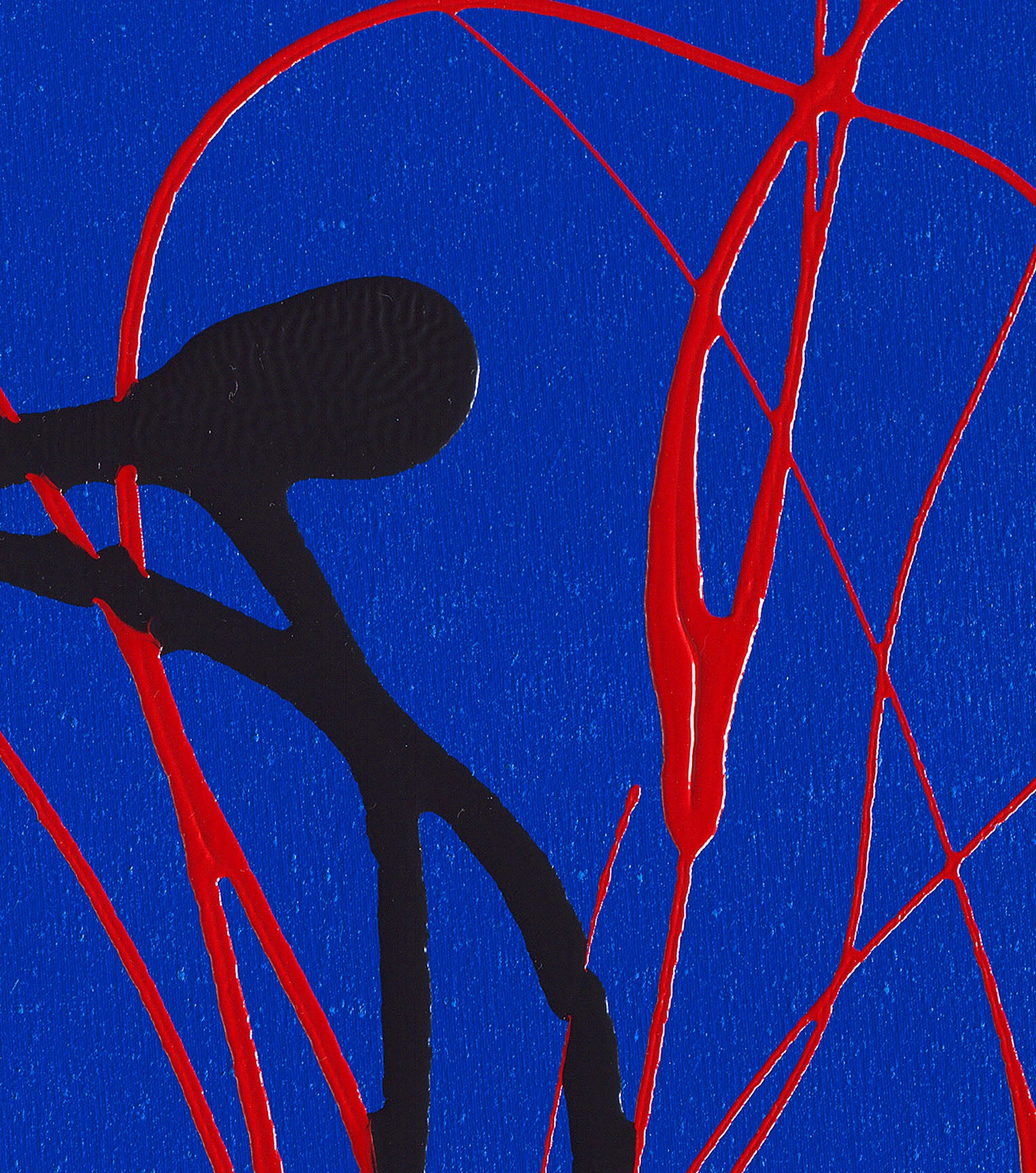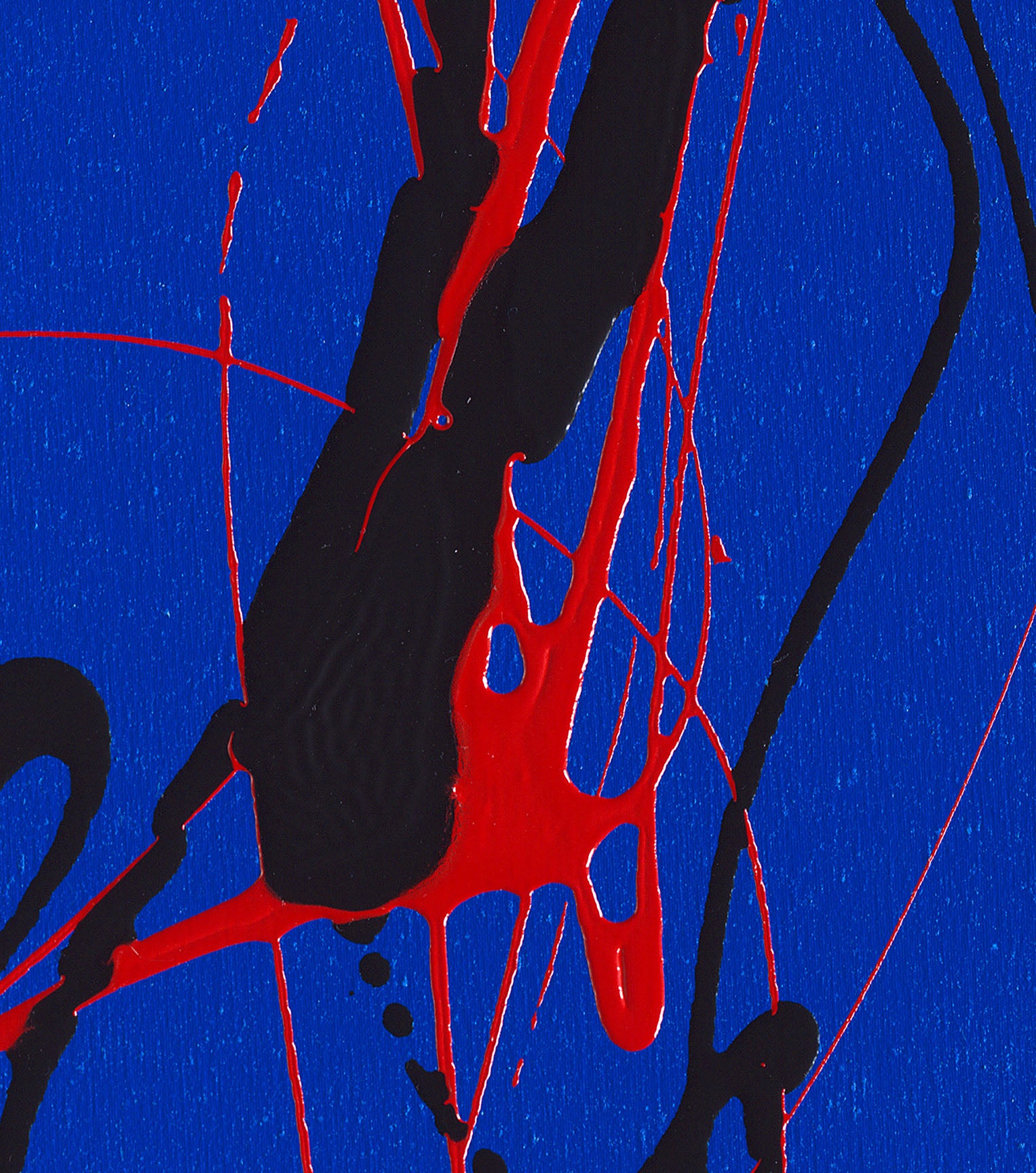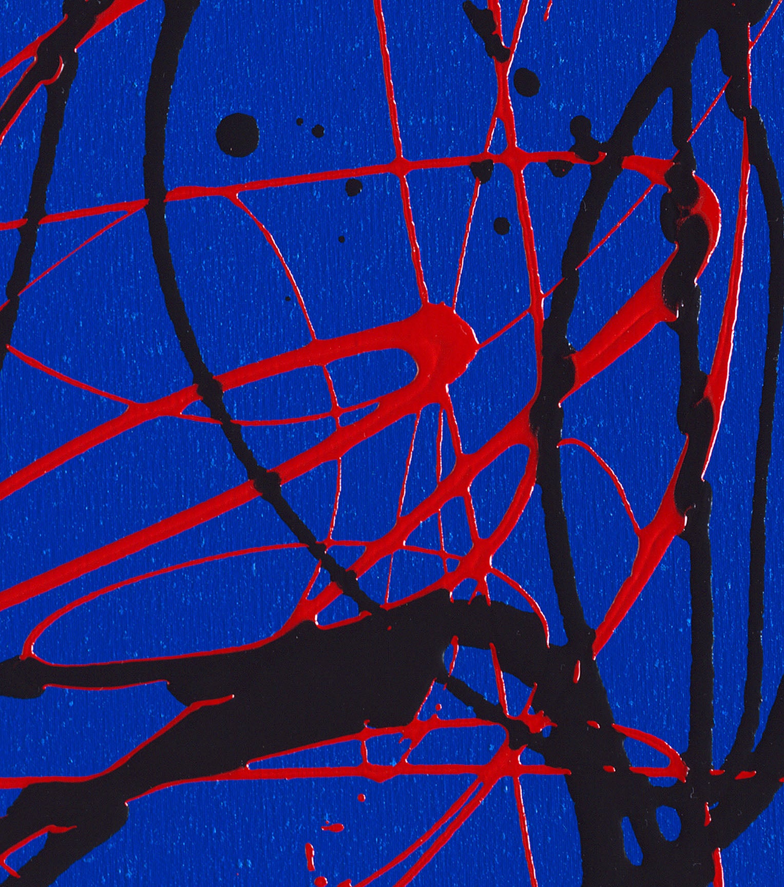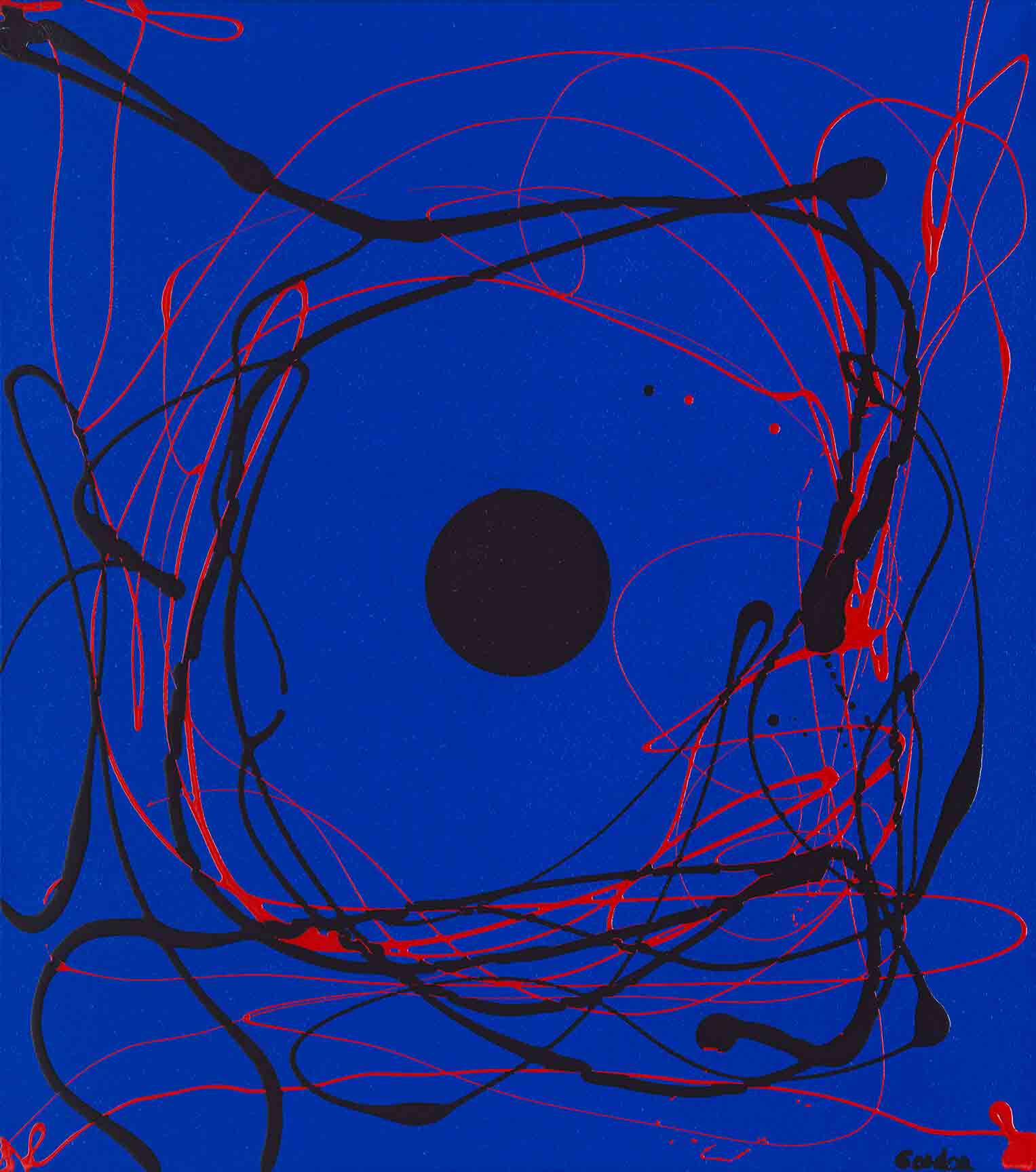Measuring 95 x 85 cm (37 x 33 inches), 'Vitality 3' captures the essence of life's deepest patterns and the unity of consciousness. Each stroke is a journey into the fluid freedom of thought, moving tradition into modernity with every layer. The black sphere amidst a vibrant blue and red spatter creates a mesmerizing visual experience, inviting introspection and awe.