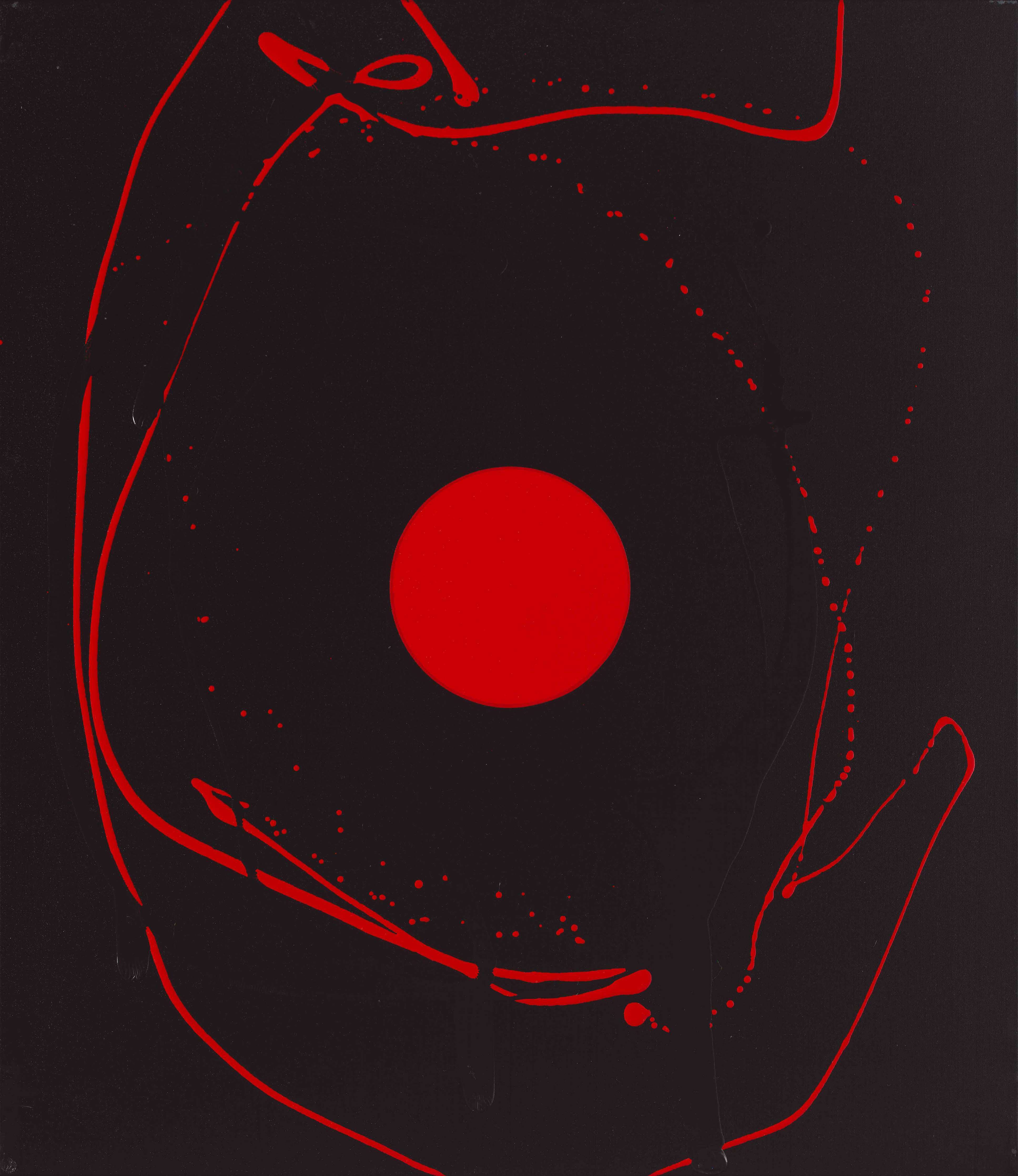 This piece features a central black sphere on a vibrant red background, creating a powerful visual statement. Measuring 75 x 65 cm (29 x 26 in), 'Emotion 11' makes a striking addition to any art collection. Previously exhibited at the prestigious Hotel De Paris in Monte Carlo and Hotel Majestic in Cannes, this painting carries a distinguished provenance directly from the artist, Antonia Pia Gordon. It's a piece that speaks volumes about the irresistible attraction of opposites and the fearless co-existence of vivid and dramatic colors.Details