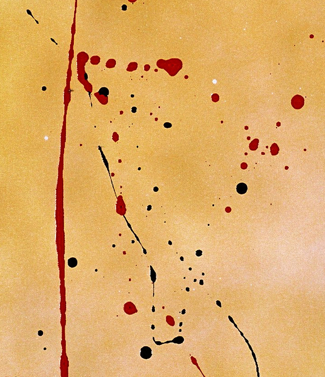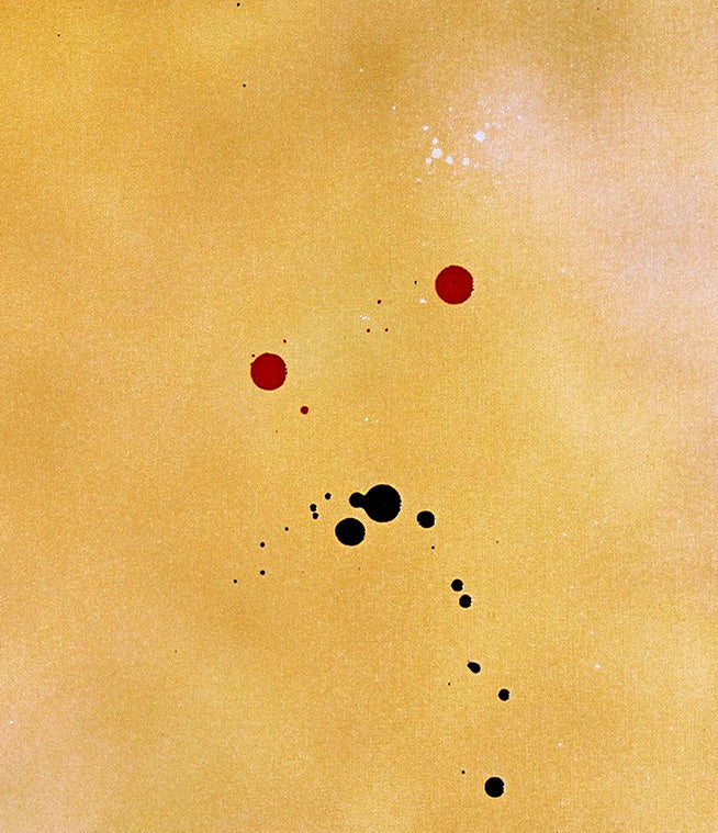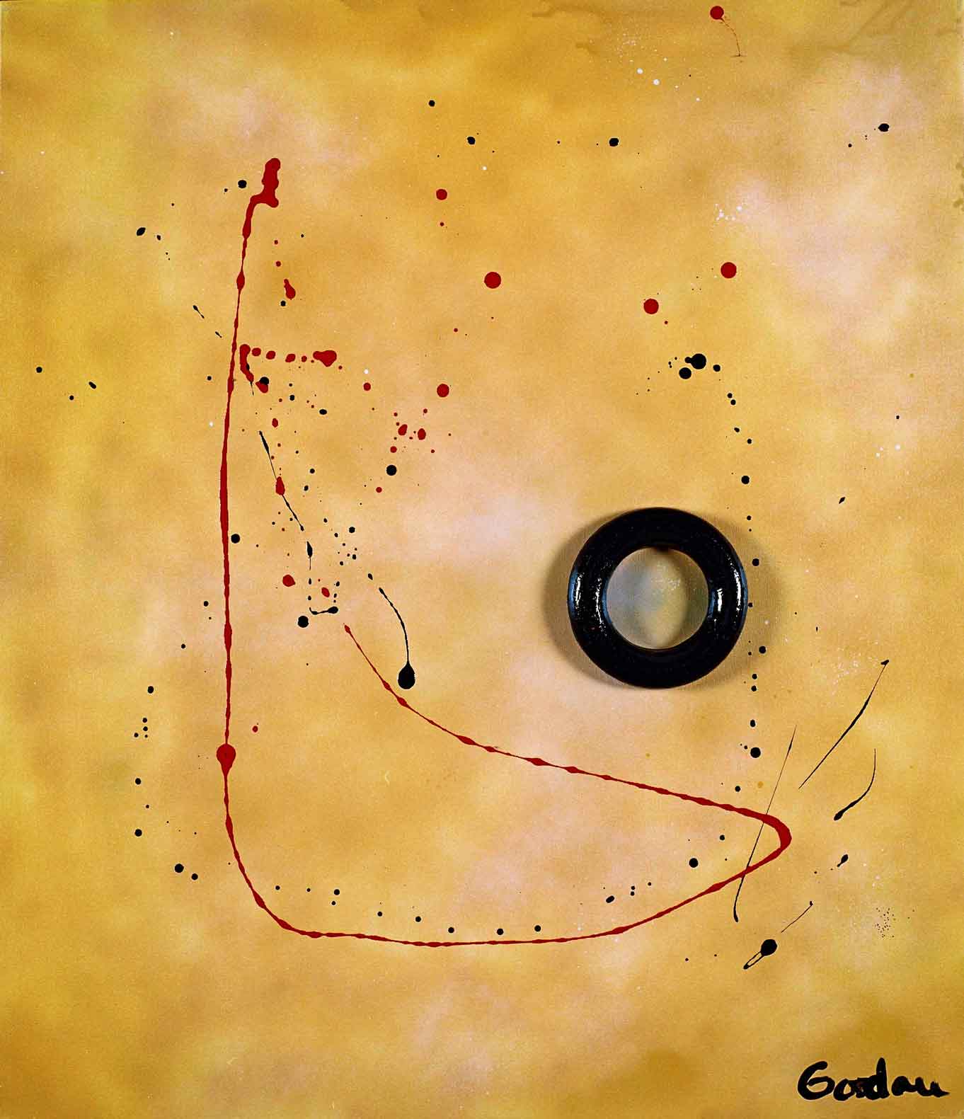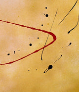 Imagine this stunning 85 x 95 cm (33 x 37 in) painting gracing your living space, infusing it with a sense of vitality and sophistication. The vibrant yellow canvas, punctuated by bold black rings and a spatter of red, creates a visual dialogue that is both stimulating and harmonious. Collectors who value pieces that speak to both tradition and modernity will find themselves drawn to the exquisite duality present in this work.