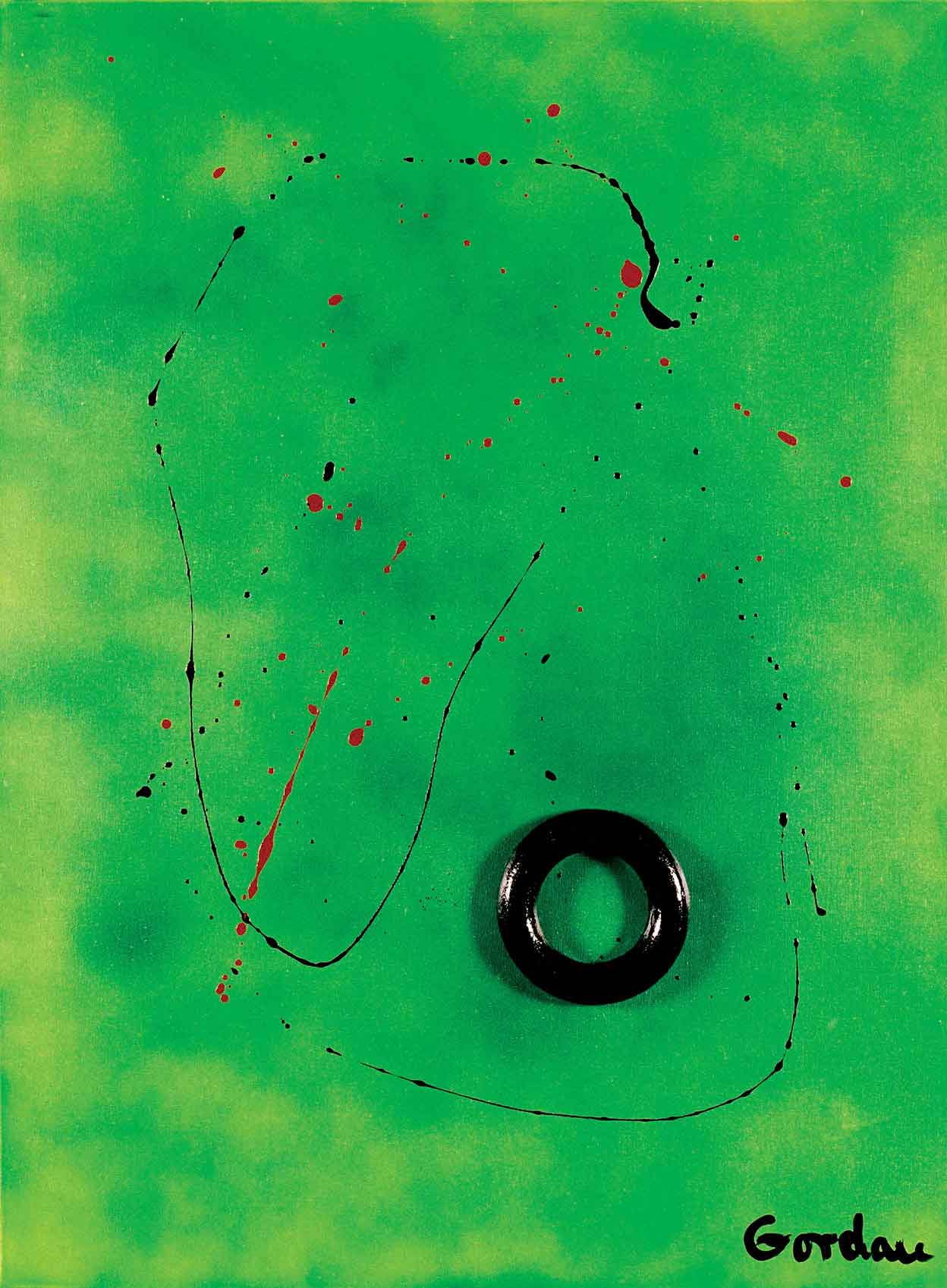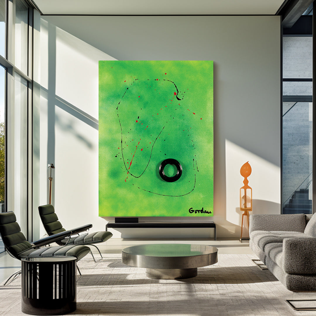 Imagine this stunning 85 x 95 cm (33 x 37 in) painting gracing your living space, infusing it with a sense of vitality and sophistication. The vibrant yellow canvas, punctuated by bold black rings and a spatter of red, creates a visual dialogue that is both stimulating and harmonious. Collectors who value pieces that speak to both tradition and modernity will find themselves drawn to the exquisite duality present in this work.
