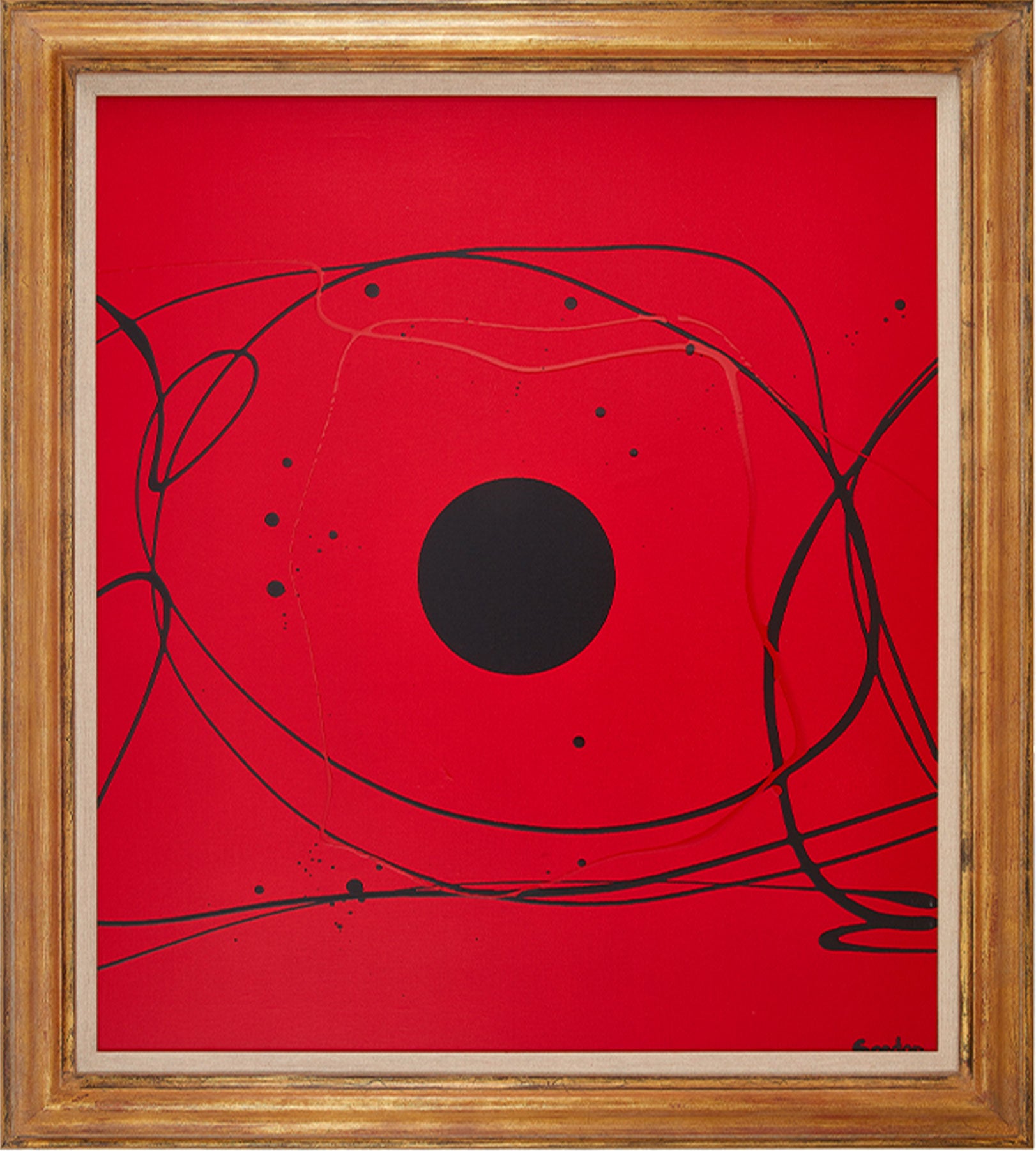 This piece features a central black sphere on a vibrant red background, creating a powerful visual statement. Measuring 75 x 65 cm (29 x 26 in), 'Emotion 11' makes a striking addition to any art collection. Previously exhibited at the prestigious Hotel De Paris in Monte Carlo and Hotel Majestic in Cannes, this painting carries a distinguished provenance directly from the artist, Antonia Pia Gordon. It's a piece that speaks volumes about the irresistible attraction of opposites and the fearless co-existence of vivid and dramatic colors.Details