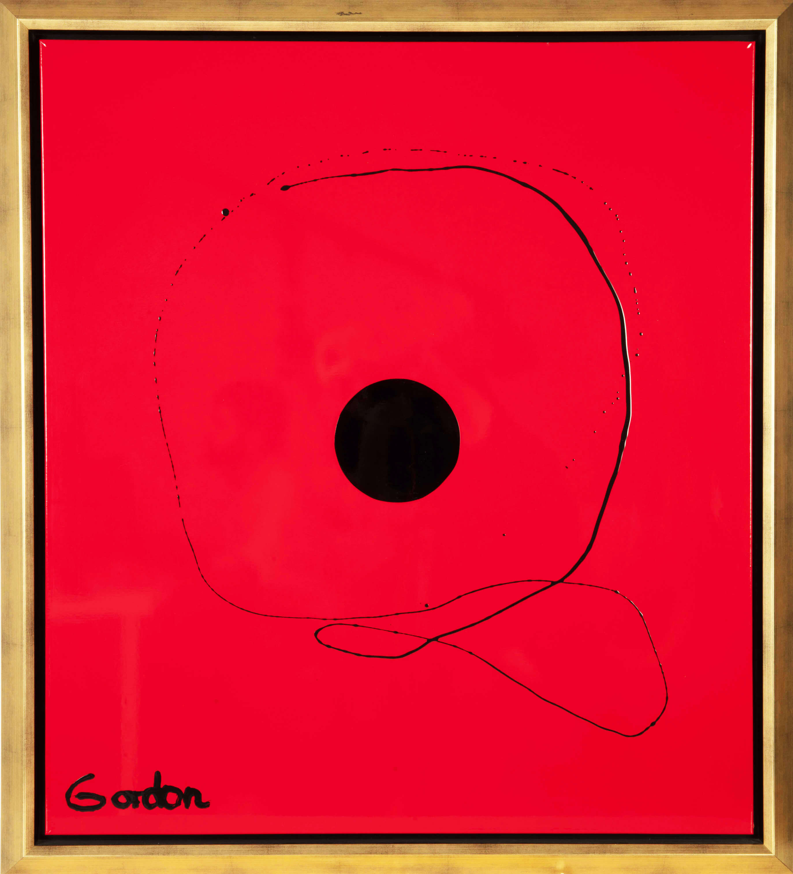 This piece features a central black sphere on a vibrant red background, creating a powerful visual statement. Measuring 75 x 65 cm (29 x 26 in), 'Emotion 11' makes a striking addition to any art collection. Previously exhibited at the prestigious Hotel De Paris in Monte Carlo and Hotel Majestic in Cannes, this painting carries a distinguished provenance directly from the artist, Antonia Pia Gordon. It's a piece that speaks volumes about the irresistible attraction of opposites and the fearless co-existence of vivid and dramatic colors.Details